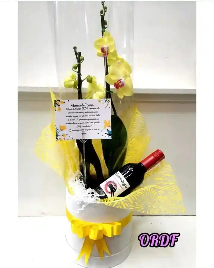 Orquídea de dos varas decorada junto a una botella de vino gato negro Este producto esta sujeto a cambios de colores dependiendo su temporada y disponibilidad