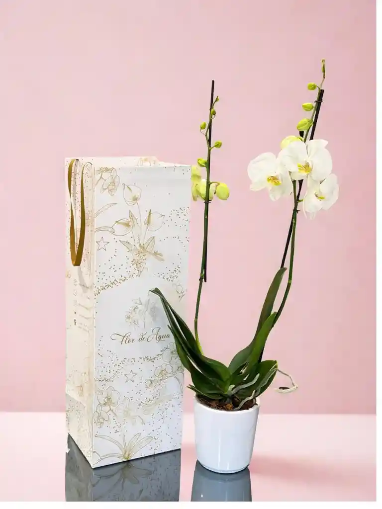 Orquidea grande de 2 varas blanca con matera blanca, acompañada de nuestro hermoso empaque de lujo.