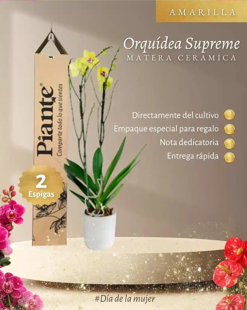 Dale un toque especial a cualquier espacio con nuestra Orquídea Supreme, una planta elegante, delicada y perfecta para decorar salas, oficinas, escritorios o sorprender con un regalo lleno de vida. 💐 Flores exóticas y sofisticadas. 🌿 Tamaño ideal para cualquier ambiente. ✨ Seleccionadas cuidadosamente para garantizar frescura y excelente presentación. El color puede variar según el estado de floración, haciendo que cada planta sea única. Podrás recibir tonalidades blancas, rosadas, fucsias, amarillas o combinaciones naturales, según disponibilidad y proceso natural de la flor. 📸 La fotografía es imagen de referencia. El color puede variar según disponibilidad y etapa de floración. 🌺 Un detalle hermoso, natural y lleno de elegancia.