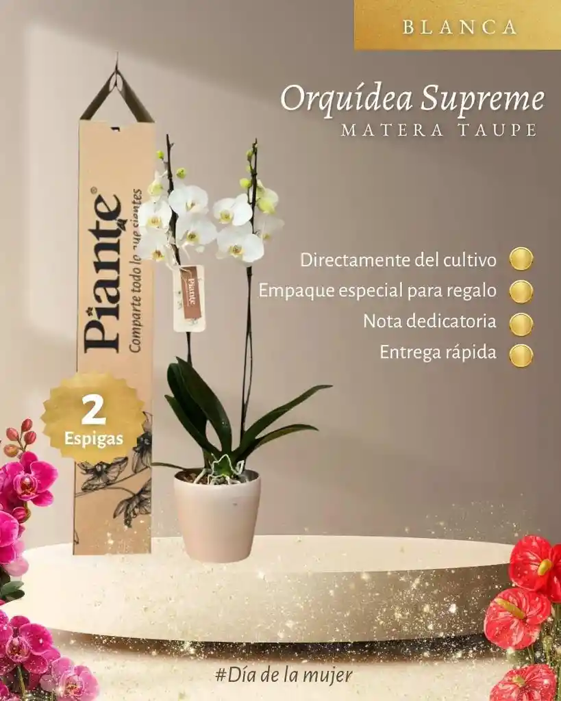 Descubre la armonía perfecta entre elegancia natural y diseño contemporáneo con nuestra Orquídea Supreme de Dos Varas, presentada en una sofisticada matera Taupe 15, un tono neutro y moderno que realza cualquier espacio con estilo y distinción. Esta orquídea pertenece a nuestra línea Supreme, seleccionada cuidadosamente por su excelente desarrollo, floración avanzada y calidad superior. Sus dos varas florales brindan mayor volumen, presencia y un impacto visual inmediato, convirtiéndola en una pieza protagonista para hogares, oficinas o regalos especiales. La matera Taupe 15, de acabado sobrio y minimalista, aporta un toque premium que combina fácilmente con cualquier estilo de decoración, desde lo clásico hasta lo moderno. Las flores pueden variar en tonalidad, forma y grado de apertura. Las imágenes son de referencia y reflejan el estilo y calidad del producto. Llévala hoy y disfruta de una experiencia natural que marca la diferencia.