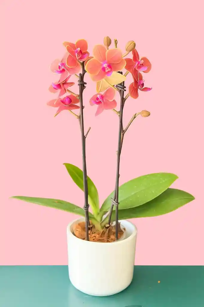 Orquidea mediana de 2 varas naranja con matera de ceramica
