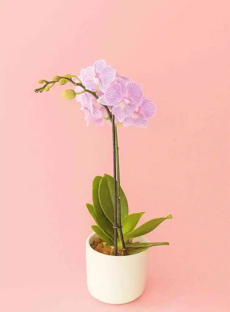 Orquidea mediana rosada de 1 vara con matera de ceramica blanca, la variedad puede cambiar.