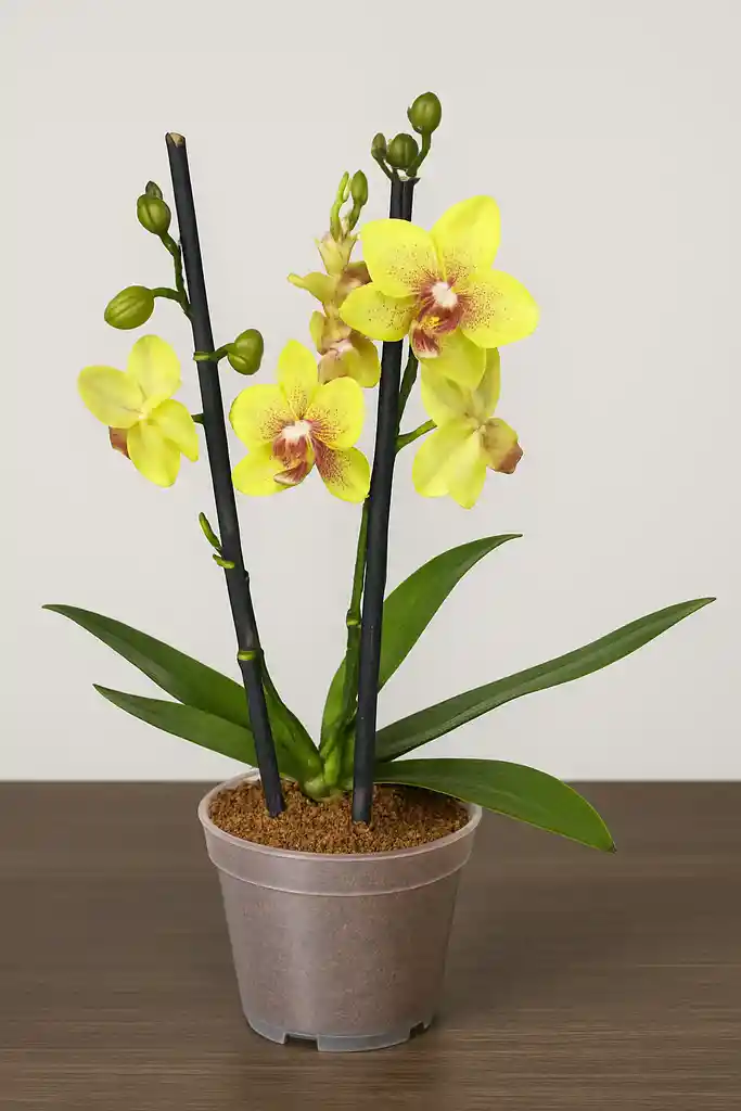 Una Phalaenopsis de flores amarillas moteadas hacia el centro rojizo, también en maceta transparente sobre el mismo escritorio. Desde el nivel del sustrato hasta la punta de la hoja más alta, la planta alcanza cerca de 25–30 cm. Sus dos varas florales, apoyadas en tutores negros, exhiben cuatro flores abiertas y varios capullos listos para florecer.