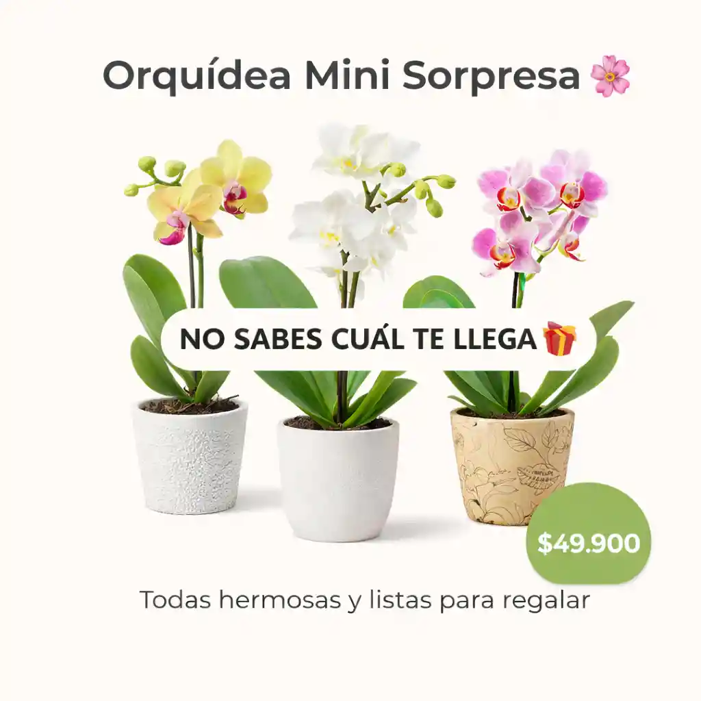 Un detalle delicado y lleno de vida para sorprender hoy 🌸 Recibe una orquídea mini o baby (1 o 2 varas) en matera decorativa, elegida cuidadosamente por nosotros. ✨ Ideal para: Regalos elegantes Sorprender sin complicarte Detalles especiales 🎁 Incluye: Orquídea mini o baby sorpresa Matera decorativa Empaque listo para regalo 🚚 Entrega rápida en Cali 👉 Confía en nosotros, siempre elegimos una hermosa. Cada planta es única - llegará una planta sorpresa #sorpresasverdes