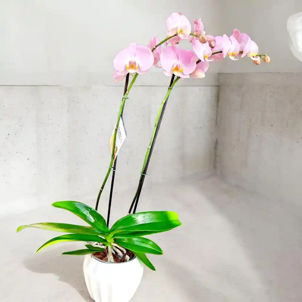 Elegante orquídea phalaenopsis de doble vara floral con hermosas flores rosadas que aportan delicadeza y sofisticación a cualquier espacio. Una planta ideal para regalar o decorar el hogar u oficina. 🌿 Características: Orquídea Phalaenopsis natural Dos varas florales con múltiples flores Color rosado suave y elegante Presentación en matera de cerámica (color disponible en tienda) 💧 Cuidados básicos: Ubicar en luz indirecta brillante Regar 1 vez por semana aproximadamente Evitar el exceso de agua Mantener en espacios ventilados y sin sol directo 🎁 Ideal para: Regalos especiales, cumpleaños, aniversarios o detalles elegantes. Una planta que simboliza amor, belleza y elegancia, perfecta para sorprender con un detalle natural 🌸💗