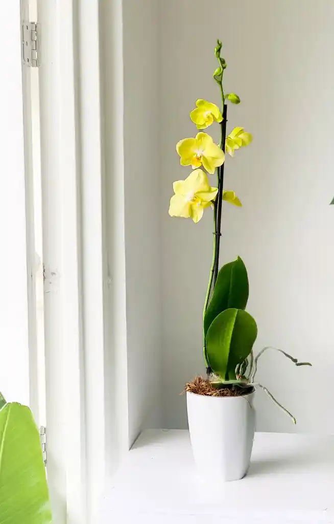 Orquídea Phalaenopsis Amarilla en Maceta Blanca La Orquídea Phalaenopsis Amarilla en maceta blanca es una planta elegante, luminosa y altamente decorativa. Sus pétalos en tonos amarillos suaves aportan un toque cálido y moderno a cualquier ambiente, mientras que sus hojas verdes y carnosas resaltan la frescura natural de la planta. Gracias a su aspecto estilizado y a su maceta minimalista, es perfecta para realzar salas, habitaciones, escritorios o espacios donde se desee agregar un punto de color sutil y sofisticado. Características principales Floración larga y duradera en tonos amarillos Maceta blanca elegante que combina con cualquier estilo Planta refinada, ideal para decoración interior Perfecta para regalar en ocasiones especiales Muy valorada por su belleza, porte y facilidad de cuidado Cuidados Riego: Regar cada 7 a 10 días. Evitar encharcamientos. Luz: Requiere luz indirecta brillante, sin sol directo. Ambiente: Prefiere espacios cálidos y bien ventilados. Humedad: Agradece ambientes húmedos. Fertilización: Usar abono para orquídeas cada 20 a 30 días durante la floración. Beneficios Aporta color suave y elegante Planta de bajo mantenimiento Floración que puede durar semanas Ideal para dar un toque distinguido sin ocupar mucho espacio Nota importante: Las plantas pueden variar en forma y tamaño respecto a la foto, ya que cada una es única. Si tu pedido es para regalo, escríbenos por el chat de Rappi: incluimos decoración especial y tarjeta personalizada sin costo adicional.