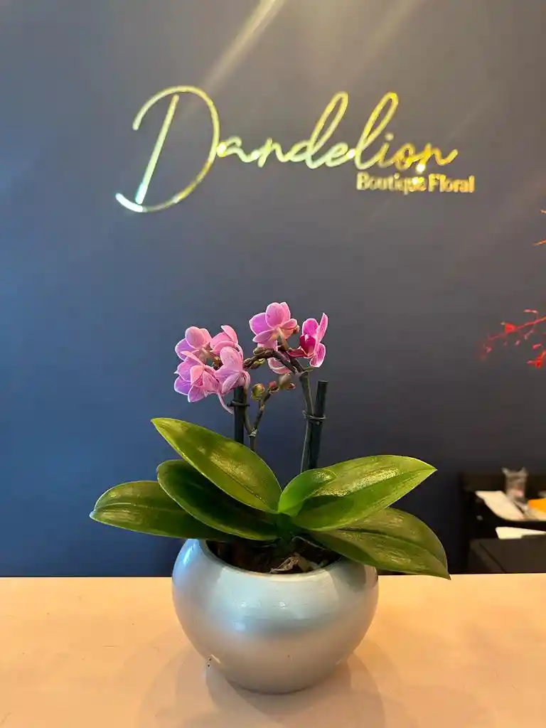 Hermosa Orquidea Premium Mini Contiene 2 espigas de Orquidea Mini Premium Sembrada en lujosa matera color Plata Admira su floración de 4 meses Incluye toda la decoración y empaque Mensaje personalizado si lo deseas