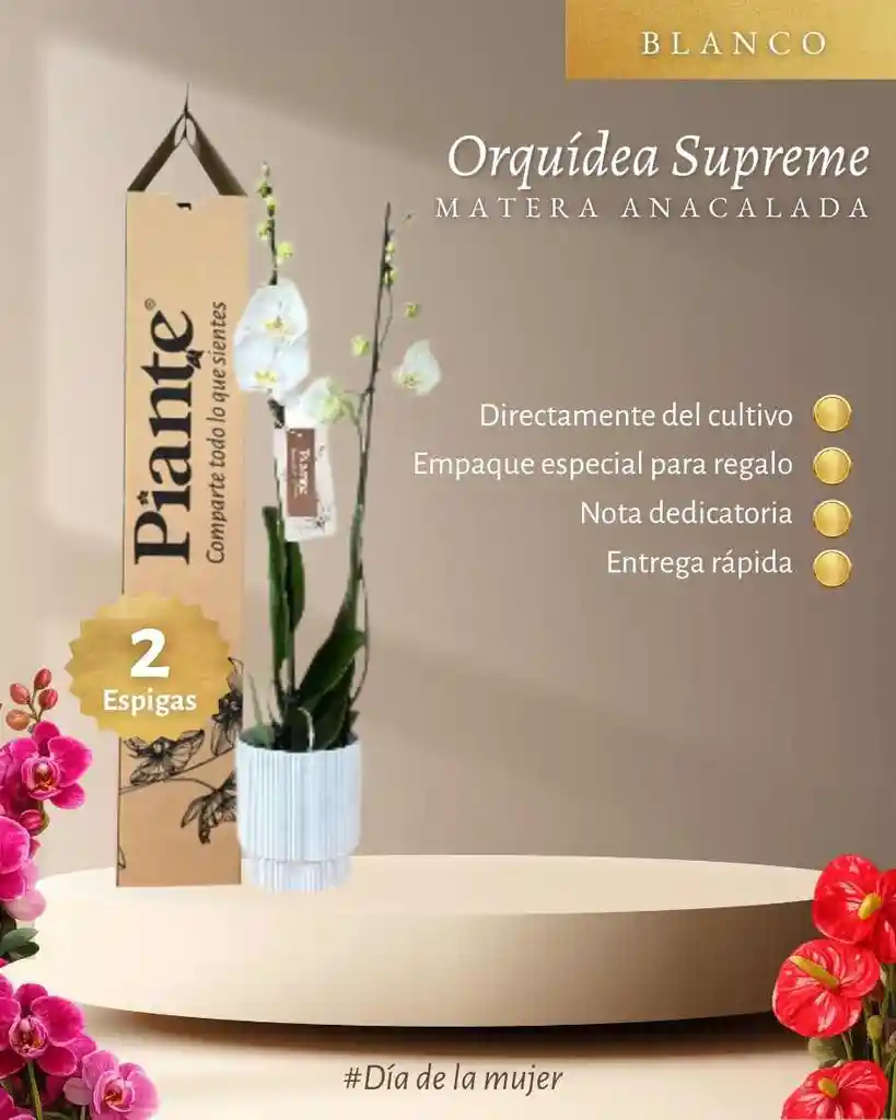 Nuestra Orquídea Supreme es una planta de categoría superior, seleccionada cuidadosamente por su excelente desarrollo, calidad floral y presentación impecable. Es ideal para quienes buscan una opción sofisticada y de alto impacto visual en decoración natural. Se presenta en una matera de cerámica blanca acanalada , un diseño elegante y atemporal que aporta luminosidad, armonía y estilo a cualquier espacio. Su acabado acanalado realza la textura y convierte esta presentación en una pieza decorativa versátil, perfecta para ambientes modernos, clásicos o minimalistas. Esta combinación logra un equilibrio ideal entre naturaleza y diseño, convirtiéndola en una excelente opción para el hogar, la oficina o como regalo especial.