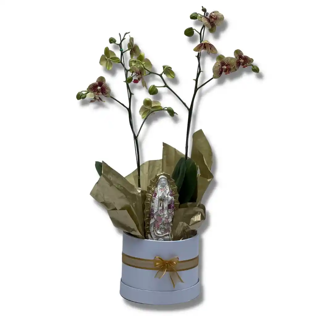 Hermosa Orquídea 2 varas color según disponibilidad con una Virgen decorada a mano, en baúl redondo. (la virgen es según disponibilidad)