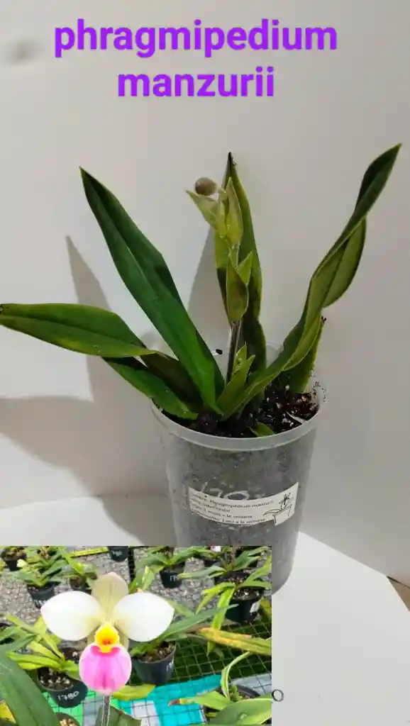 orquidea zapatico ( phragmipedium manzurii) en flor de riego 3 veces por semana y luz brillate filtrada.
