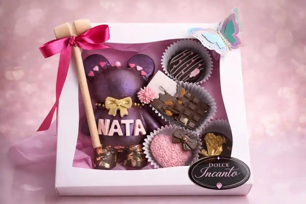 Este delicado box reúne dulzura, elegancia y un toque de magia en cada elemento. En su interior encontrarás: Un tierno oso de chocolate personalizado, con relleno de gomitas y dulces Acompañado de dos oreos con cobertura de chocolate finamente decoradas Una barra de chocolate rellena de frutos secos Un corazón de chocolate relleno de caramelo Esto viene en una hermosa caja decorada con tarjeta personalizada y un mini martillo para romper el oso pequeños detalles que hacen de este box una experiencia única.