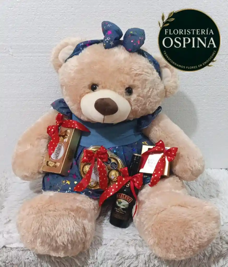 an tierna como un abrazo de medianoche y tan dulce como un beso robado 💞. Nuestra Osita Galaxia Deluxe llega vestida de estrellas, acompañada de exquisitos chocolates Ferrero Rocher, Baileys y mucho, muchísimo amor 💫. Perfecta para decir “te pienso a cada instante”, para encender suspiros o conquistar corazones con elegancia y dulzura 🧸🍫🍷✨ 💌 Si deseas incluir una tarjeta personalizada, recuerda solicitarla al momento de la compra. 💚 Floristería Ospina – Transformamos flores en emociones