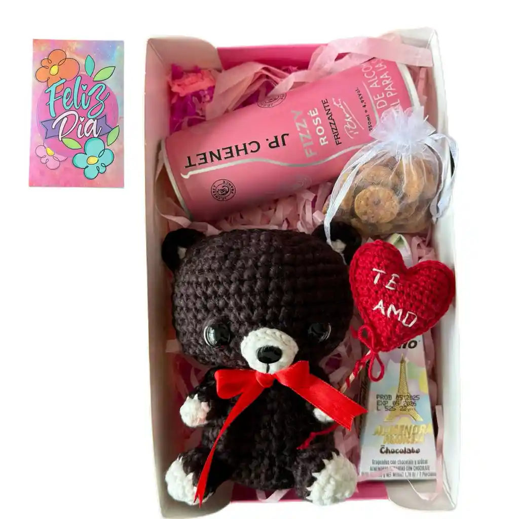 Detalle romántico con osito amigurumi hecho a mano. Osito amigurumi hecho a mano (16 cm). Lata JP Chenet Fizzy Rosé 250 ml Mini galletas en bolsa de organza. Almendra Francesa Italo 50g. Topper corazón tejido “Te amo”. Tarjeta “Feliz Día” + papel seda y caja rígida decorada. → Escribe tu dedicatoria en “Comentario al Shopper”.