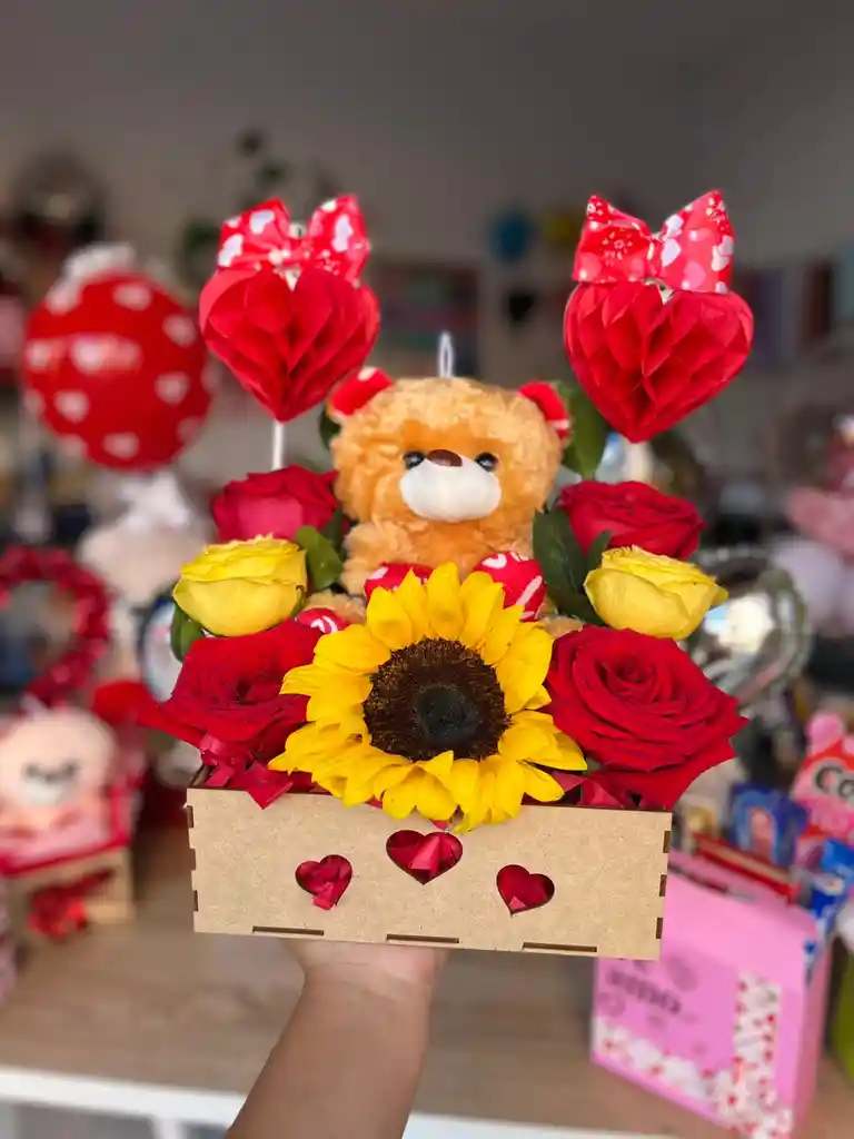 Incluye: caja de madera, girasol x1, rosas rojas x4, rosas amarillas x2, oso de peluche (varía según disponibilidad), follaje, mensaje personalizado.