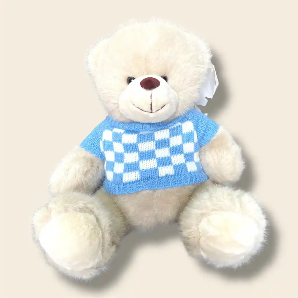 Es el compañero perfecto que irradia ternura y alegría. Este suave y mullido oso de peluche, de un delicado color crema, invita a los abrazos con su textura irresistible y su dulce expresión. Sus ojos pequeños y brillantes, junto con su nariz marrón y una sonrisa acogedora, le otorgan un carácter entrañable que conquista a primera vista. Lo que hace a este osito verdaderamente especial es su acogedor suéter de punto, con un vibrante diseño cuadriculado en azul cielo y blanco. Este atuendo no solo le añade un toque de encanto y diversión, sino que también realza su personalidad amigable y juguetona. Perfecto para regalar en cualquier ocasión, desde un baby shower hasta un cumpleaños, o simplemente para decorar una habitación con un toque de dulzura y confort, nuestro Osito Juguetón es más que un juguete; es un amigo fiel que promete sonrisas y momentos inolvidables.
