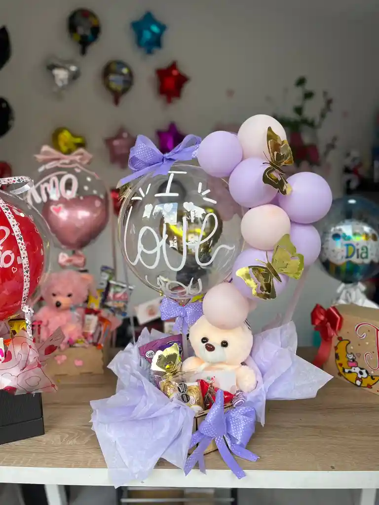 Caja decorativa con globos personalizado, peluche que puede varias según disponibilidad, dulces surtidos x4, mensaje personalizado