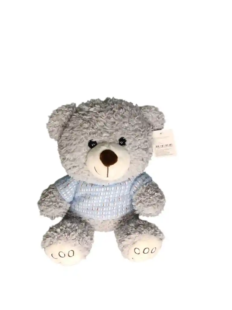 Oso mediano gris con saco, material 100% poliéster antialérgico medidas 25 cm de alto por 20 cm de ancho