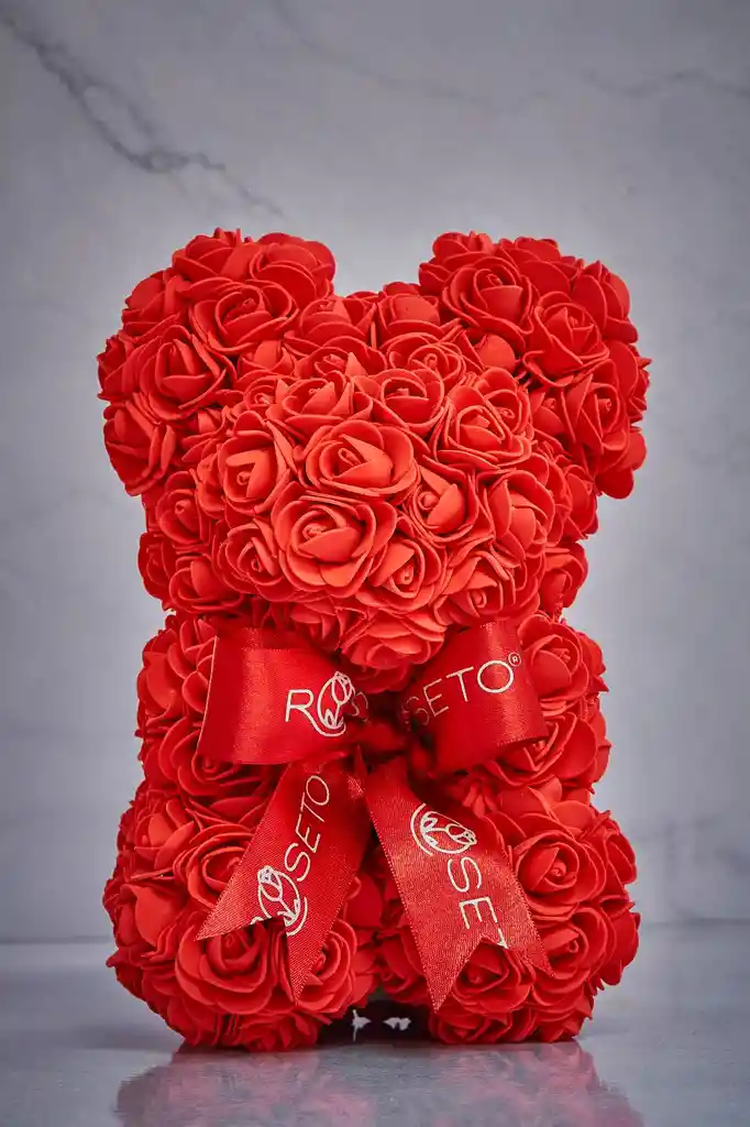 Hermoso oso fabricado con mas de 300 rosas, acompañado de lazo y tarjeta