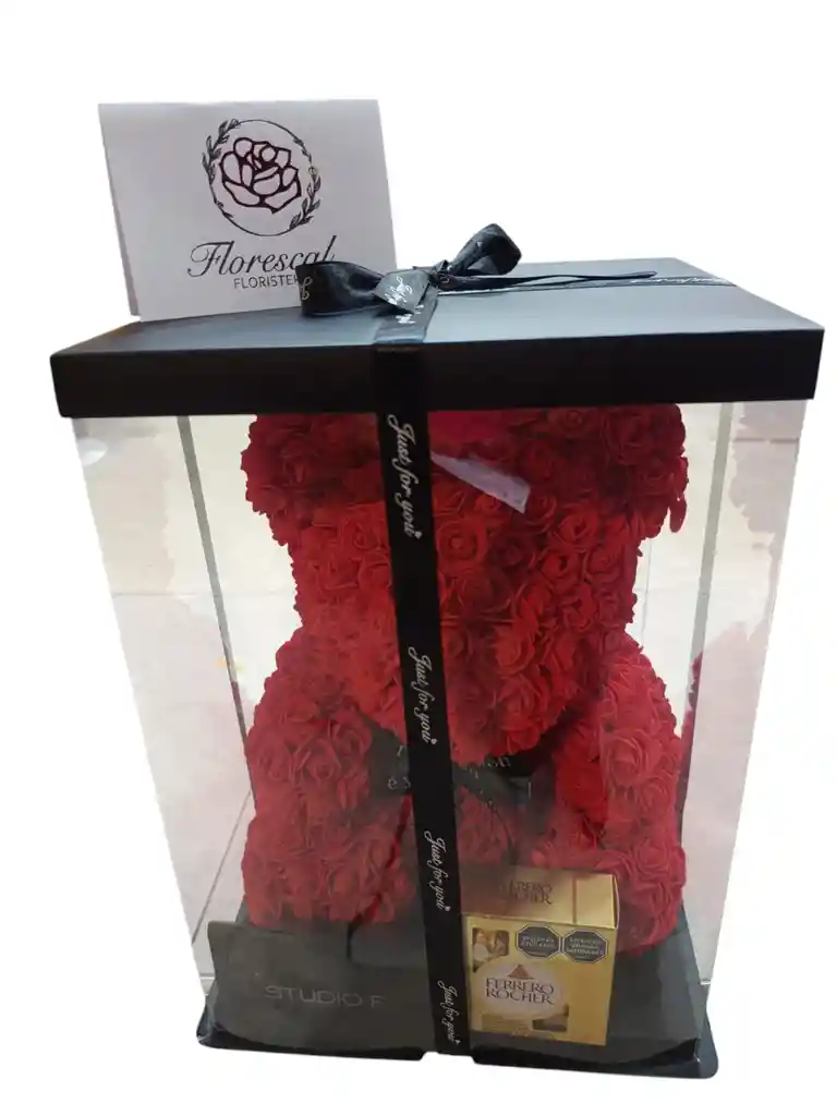 OSO DE ROSAS EN FOAMY DE 20 CM APROXIMADAMENTE CON CAJA EN ACETATO MOÑO Y TARJETA PERSONALIZADA PARA EL MENSAJE COMUNICATE AL 3014652821