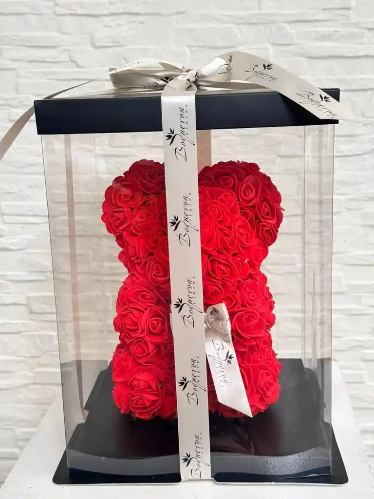 Oso en rosas rojas artificiales, espectacular oso de 25 cm aproximadamente, con caja y cinta de empaque.