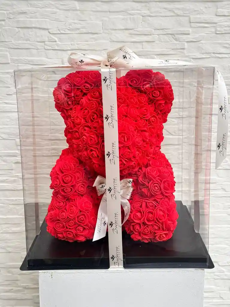 Oso en rosas rojas artificiales, espectacular oso de 35 cm aproximadamente, con caja y cinta de empaque.