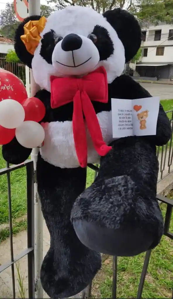 imponente oso de peluche Panda, moño, globo, tarjeta con mensaje personalizado