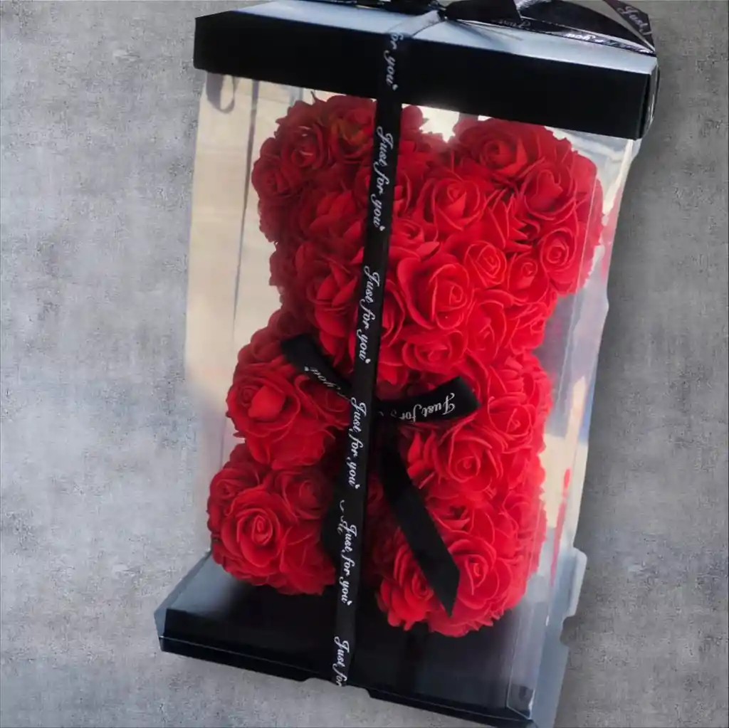 Oso en rosas minis de foam8 con caja de acetato moño y tarjeta 20 cm
