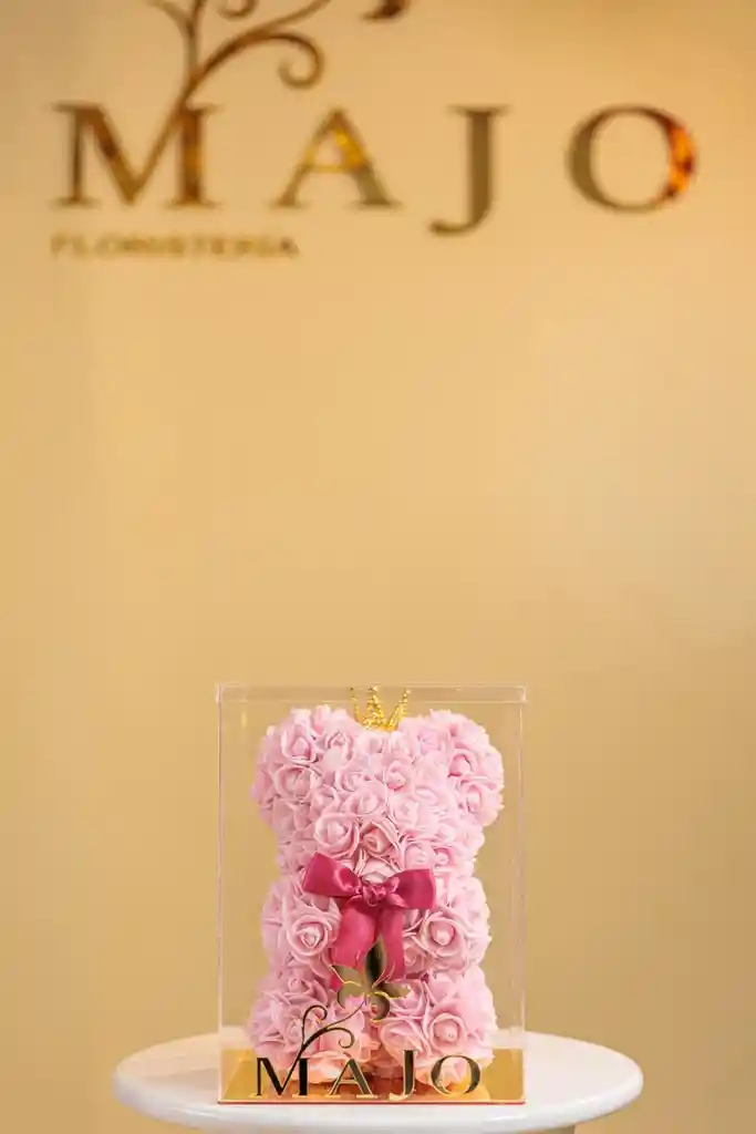 Oso en rosas de foamy, delicado y elegante, presentado en caja acrílica transparente que resalta su belleza. Un detalle moderno, tierno y duradero. Disponibles. rosados, rojos