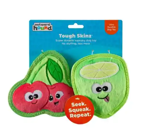 Este set de juguetes Tough Skinz de Outward Hound incluye dos divertidas figuras de frutas (cerezas y lima) diseñadas para la máxima durabilidad. Están fabricados con una tecnología sin relleno, lo que evita desorden en casa si la mascota logra romperlos, y cuentan con un chirriador interno que incentiva el juego interactivo. Sus costuras reforzadas y texturas resistentes los hacen ideales para perros que disfrutan de morder y sacudir sus juguetes, proporcionando entretenimiento prolongado y seguro.