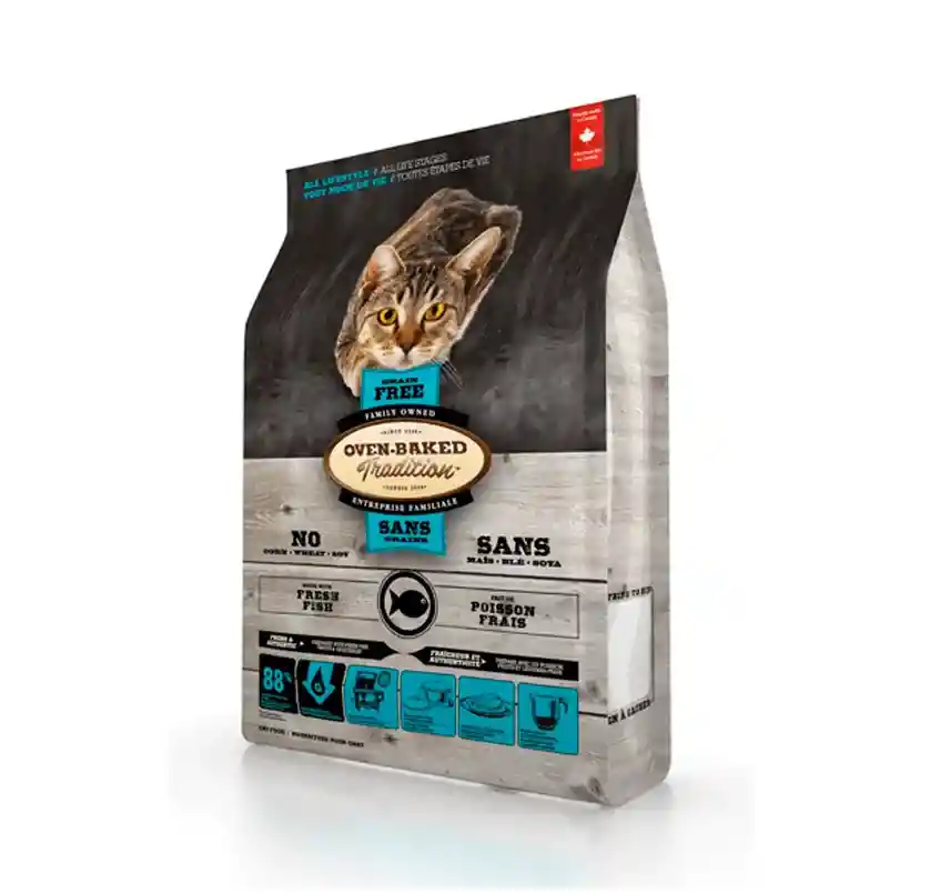 Grain Free Cat-Fish Oven-Baked es un alimento libre de grano indicado para gatitos y gatos (de interior o exterior). El 88% de las proteínas en esta receta proviene de pescado y huevos. Se cocina lentamente a baja temperatura en el horno en pequeñas porciones para garantizar la frescura y la calidad. Bajo índice glucémico.