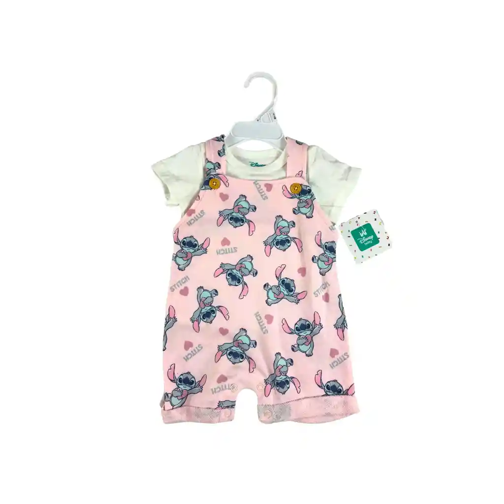Talla: 3-6 meses Conjunto para bebé compuesto por overol corto y camisa de manga corta. El overol presenta diseño rosado con estampado de Stitch y detalles decorativos, con tirantes ajustables mediante botones y broches en la parte inferior que facilitan el cambio de pañal. La camisa es de tela suave y cómoda, ideal para el uso diario. Es una prenda fresca, práctica y confortable, perfecta para climas cálidos, salidas o como opción de regalo.