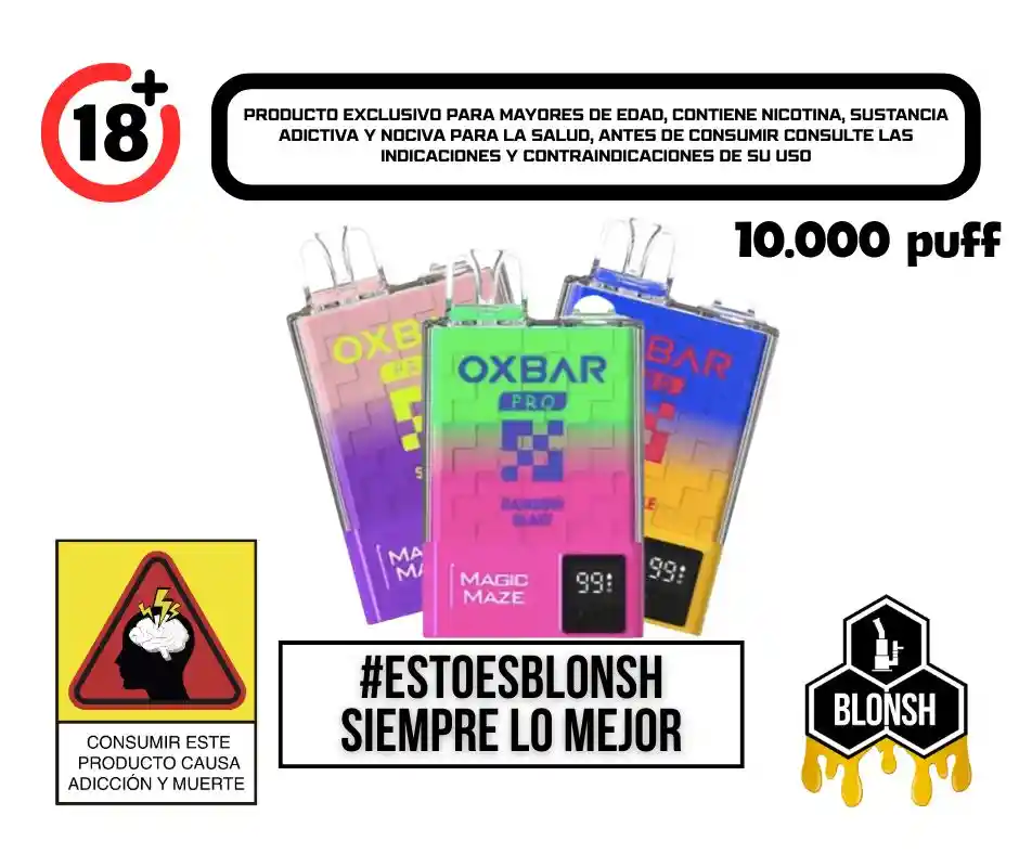 OXBAR Pro 10K Puffs -Desechable El vaporizador OXBAR Pro 10K Puffs -Desechable ofrece una impresionante cantidad de 18 ml de líquido precargado, lo que garantiza sesiones de vapeo prolongadas. Es el primer vaporizador desechable del mundo con potencia ajustable, lo que le permite personalizar su experiencia con facilidad. Con un simple clic, puede cambiar sin esfuerzo entre 11 W y 15 W, lo que garantiza un control preciso sobre sus preferencias de vapeo. Si se utiliza correctamente, este dispositivo puede proporcionar hasta 10 000 caladas . Su pantalla LED inteligente indica cómodamente los niveles de e-líquido, batería y potencia, manteniéndote informado en todo momento. Equipado con una batería recargable de 650 mAh y un puerto de carga USB-C, este vaporizador desechable garantiza una carga cómoda y eficiente. Con una concentración de nicotina de 50 mg (5 %), está dirigido a quienes disfrutan de la nicotina en su mejor líquido para vapear . El uso de una resistencia de malla de 1,0 ohmios garantiza un sabor mejorado y una experiencia de vapeo más suave. Además, puedes cambiar sin esfuerzo entre los estilos de vapeo RDL y MTL con solo deslizar un botón. Como beneficio adicional, este vaporizador desechable viene con un cordón personalizado de cortesía, que brinda estilo y conveniencia. . Especificación Bocanadas: 10000 bocanadas Líquido precargado: 18 ml Tipo de carga C Nicotina: 50 mg/5 % Batería: 650 mAh Resistencia: Bobina de malla de 1,0 Ω Material: PC Tamaño: 88 mm x 50,0 mm x 22,2 mm Peso: 80,5 g Contenido del paquete: 1x OXBAR x Pod Juice Magic Maze Pro 10K Puff desechable 1x Cordón OXBAR Si buscas una experiencia de vapeo práctica y conveniente, considera el OXBAR PRO 10K PUFFS DESHECHABLE. Este dispositivo es ideal para quienes desean disfrutar de una gran cantidad de caladas sin complicaciones.