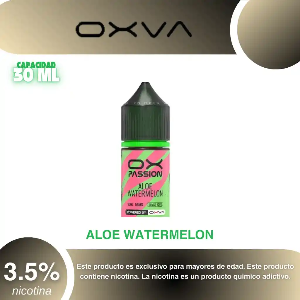 Oxva Salt Sabor Sandia Mentolada 35% PROHIBIDA LA VENTA A MENORES DE EDAD. ADVERTENCIA: ESTE PRODUCTO CONTIENE NICOTINA, LA NICOTINA ES UNA SUSTANCIA QUIMICA ADICTIVA Y NOCIVA PARA LA SALUD. Los líquidos para vapeo contienen: propilenglicol USP, glicerina USP, sabor artificial y nicotina. Este producto puede contener nicotina, una sustancia altamente adictiva que puede generar dependencia, posibles afectaciones arteriales, cardiacas, pulmonares y otras aun no identificadas. No se recomienda su uso a mujeres en embarazo, puede generar lesiones al feto. Mantener alejado de niños y mascotas. No ingerir, puede generar irritación y/o intoxicación. Por favor antes de consumir consulte a su médico posibles afectaciones o sensibilidad a alguno de sus componentes. Los componentes de este producto pueden aumentar la sensación de ansiedad En caso de notar alguna reacción adversa por favor suspenda su uso de manera inmediata. Siga las instrucciones en el envase. No alterar sus componentes. Adquiera sus productos en sitios de confianza No use productos piratas, alterados, o en los cuales no pueda comprobar su buena procedencia, Verifique la reputación del fabricante y distribuidor antes de adquirir cualquier producto Si no es usuario fumador o vapeador no se recomienda su uso bajo ninguna circunstancia Al usar este producto usted es consciente que este producto puede generar afectaciones a su salud, incluyendo aquellas que a la fecha de la compra no se han identificado y que pueden aparecer a largo plazo