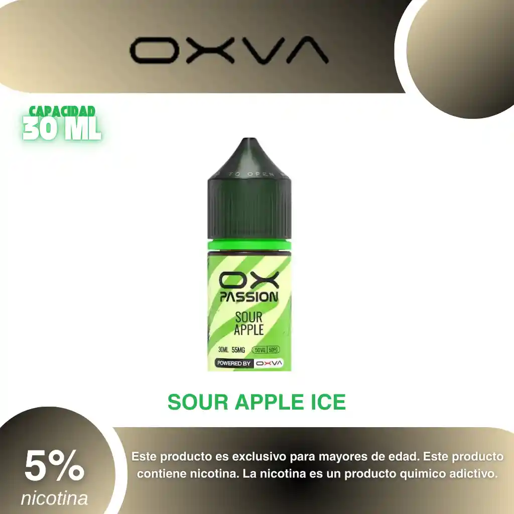 Oxva Salt Sabor Manzana Verde 55% PROHIBIDA LA VENTA A MENORES DE EDAD. ADVERTENCIA: ESTE PRODUCTO CONTIENE NICOTINA, LA NICOTINA ES UNA SUSTANCIA QUIMICA ADICTIVA Y NOCIVA PARA LA SALUD. Los líquidos para vapeo contienen: propilenglicol USP, glicerina USP, sabor artificial y nicotina. Este producto puede contener nicotina, una sustancia altamente adictiva que puede generar dependencia, posibles afectaciones arteriales, cardiacas, pulmonares y otras aun no identificadas. No se recomienda su uso a mujeres en embarazo, puede generar lesiones al feto. Mantener alejado de niños y mascotas. No ingerir, puede generar irritación y/o intoxicación. Por favor antes de consumir consulte a su médico posibles afectaciones o sensibilidad a alguno de sus componentes. Los componentes de este producto pueden aumentar la sensación de ansiedad En caso de notar alguna reacción adversa por favor suspenda su uso de manera inmediata. Siga las instrucciones en el envase. No alterar sus componentes. Adquiera sus productos en sitios de confianza No use productos piratas, alterados, o en los cuales no pueda comprobar su buena procedencia, Verifique la reputación del fabricante y distribuidor antes de adquirir cualquier producto Si no es usuario fumador o vapeador no se recomienda su uso bajo ninguna circunstancia Al usar este producto usted es consciente que este producto puede generar afectaciones a su salud, incluyendo aquellas que a la fecha de la compra no se han identificado y que pueden aparecer a largo plazo