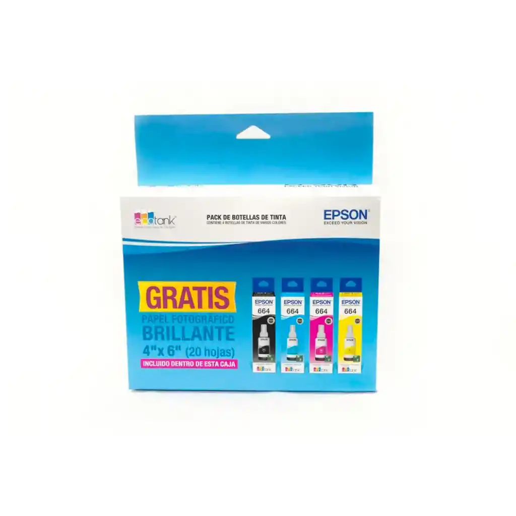 Pack 4 Botellas De Tinta Epson T664 Sku T664520-4P Nombre del Producto: Paquete de 4 Botellas de Tinta Epson T664. Modelo: T664 (Puede haber variaciones según la región o el mercado). Compatibilidad: Indicación de las impresoras Epson EcoTank con las que es compatible. Tipo de Tinta: Especificación de la fórmula de tinta utilizada en las botellas (por ejemplo, tinta a base de pigmentos o tintas a base de colorantes). Capacidad de Tinta por Botella: Cantidad de tinta en mililitros o litros por botella. Colores Incluidos: Indicación de los colores de tinta incluidos en el paquete (por ejemplo, negro, cian, magenta y amarillo). Rendimiento de Páginas: Estimación del número de páginas que se pueden imprimir con cada botella de tinta, basada en una cobertura estándar del 5% en cada página. Calidad de Impresión: Información sobre la calidad de impresión, como la resolución máxima admitida. Compatibilidad de Papel: Tipos de papel recomendados para obtener los mejores resultados de impresión. Instrucciones de Uso: Pasos recomendados para abrir, verter y almacenar la tinta de manera adecuada en la impresora. Dimensiones de la Botella: Tamaño y peso de cada botella de tinta. Información de Embalaje: Detalles sobre cómo se presenta el paquete de 4 botellas de tinta (por ejemplo, caja sellada). Información de Contacto de Epson: Datos de contacto de Epson para soporte técnico y servicio al cliente.