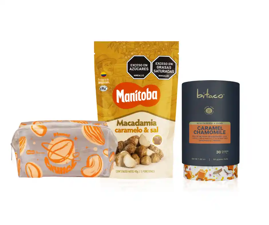 Disfruta un ritual que equilibra cuerpo y mente: 🍵 Aromática Caramel Chamomile, relajante y dulce como un abrazo. 🥜 Macadamia con Caramelo y Sal, un snack crocante y delicioso. 👜 Cosmetiquera ConsciénteTé, práctica, consciente y perfecta para acompañarte donde vayas. 👉 Un detalle pensado para regalar bienestar y armonía en cada momento.