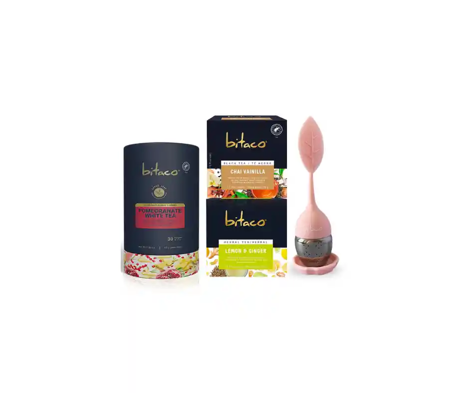 Pack bitaco contiene: TE BLANCO POMEGRANATE WHITE TEA + BITACO INFUSION HERBAL LEMON GINGER + Té Negro Chai Vainilla + Taza infusora de vidrio con filtro
