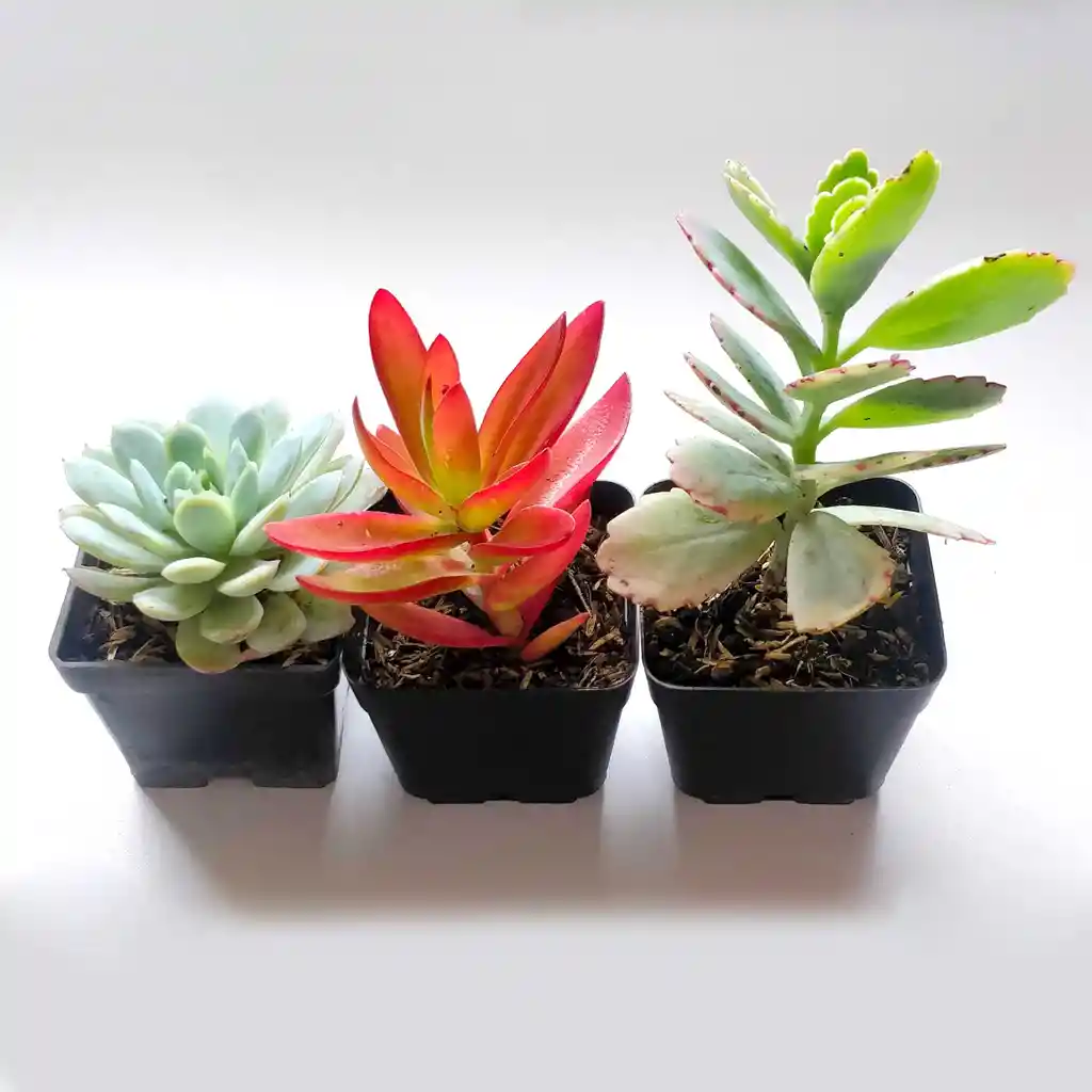 Pack de tres de suculentas, incluye 3 especies diferentes en matera plástica negra de tamaño: 6,7cm x 6,7cm x 6cm alto (medidas unicamente de la matera). Algunas de las especies que incluye: - Crassula de fuego (Crassula capitella) - Piedra de luna (Pachyphytum oviferum) - Echeveria elegans Rose - Kalannchoe laxiflora ...