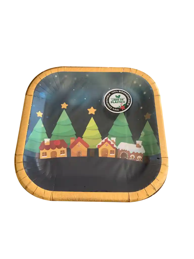 Paquete x 8 platos de 9 pulgadas de diámetro. Cartón blanco. Puede incluir acabados. Diseños exclusivos de navidad Productos totalmente libre de plástico. No son aptos para microondas