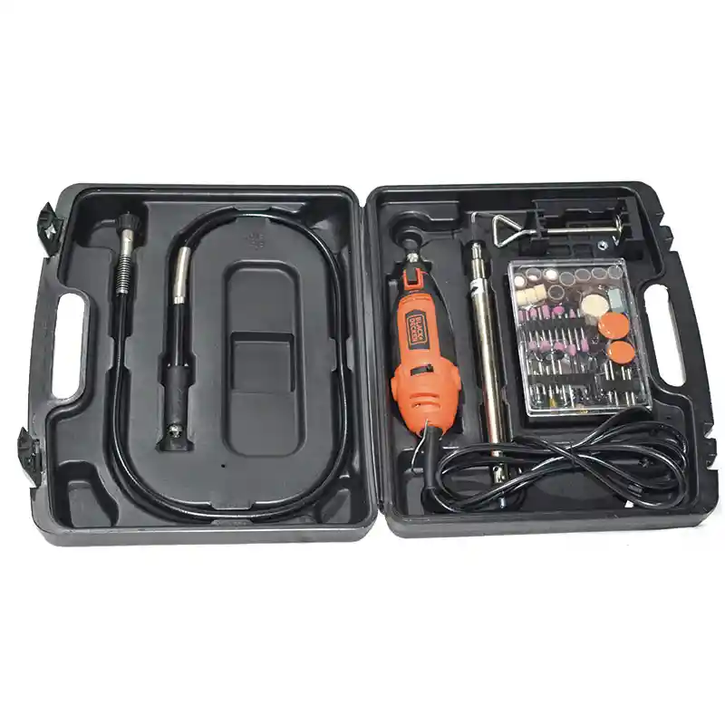 Moto Tool Black & Decker (Rt18Ka-B3) Estuche Con 113 Accesorios +Guaya Flexible Potente Motor de 180W Empuñadura Ergonómica Velocidad Variable de 0 a 35,000 Rpm Tres Collets Intercambiables: 1/8, 3/32 y 1/16 Eje Flexible Para Mayor Versatilidad Incluye 110 Accesiorios, Guaya Flexible y Estuche Plástico. SKU: 706287.