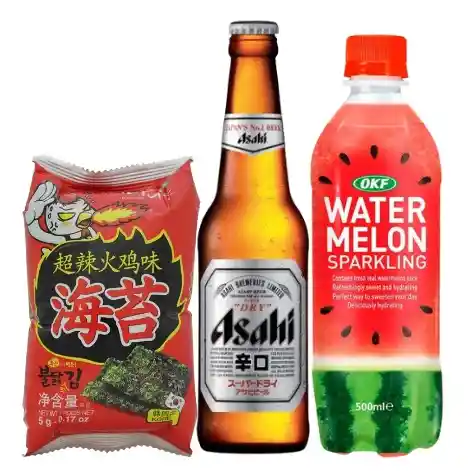 1 Cerveza Asahi 1 Sanack De Algas Corano 1 Bebida Okf Sandía X500Ml. .
