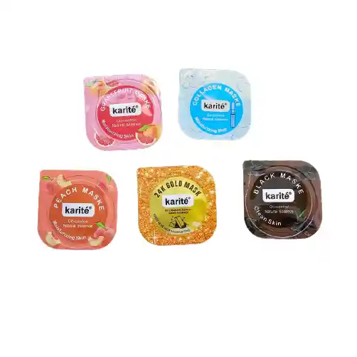 Pack de 5 mascarillas (se entrega 5 de los 6 tipos) - Karite Aloe Vera: Hidrata tu rostro. Piel: Todo tipo Black: Control de Grasa. Piel: Mixtas y Grasa 24 Gold: Anti-aging. Piel: Todo tipo Colageno: Da elasticidad. Piel: Todo tipo Toronja: Ilumina tu rostro. Piel: Todo tipo Melocoton: Hidratacion intensa. Piel: Seca