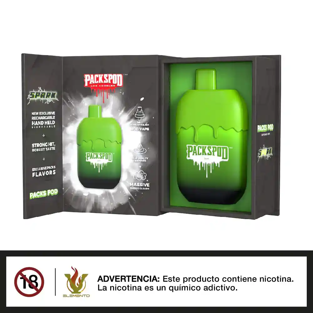 El PACKSPOD 5000 Puff Desechable viene en un E-Jugo precargado de 12ml. Tiene una enorme capacidad de batería de 1400mAh que proporciona la friolera de 5000 puff. Tiene un 5% de nicotina. Tiene un diseño de bobina de malla para una mejor experiencia de vapeo, que ofrece golpes suaves pero de garganta. Características: Capacidad de E-líquido: 12ml 5000 caladas aprox. Elemento calefactor Mesh Coil Batería recargable de 1400mAh Mecanismo de disparo activado por tiro 50mg (5%) Nic Fuerza Prohibida la venta a menores de edad. Producto nocivo para la salud que contiene nicotina, sustancia altamente adictiva. Antes de consumir consulte las indicaciones y contraindicaciones de uso