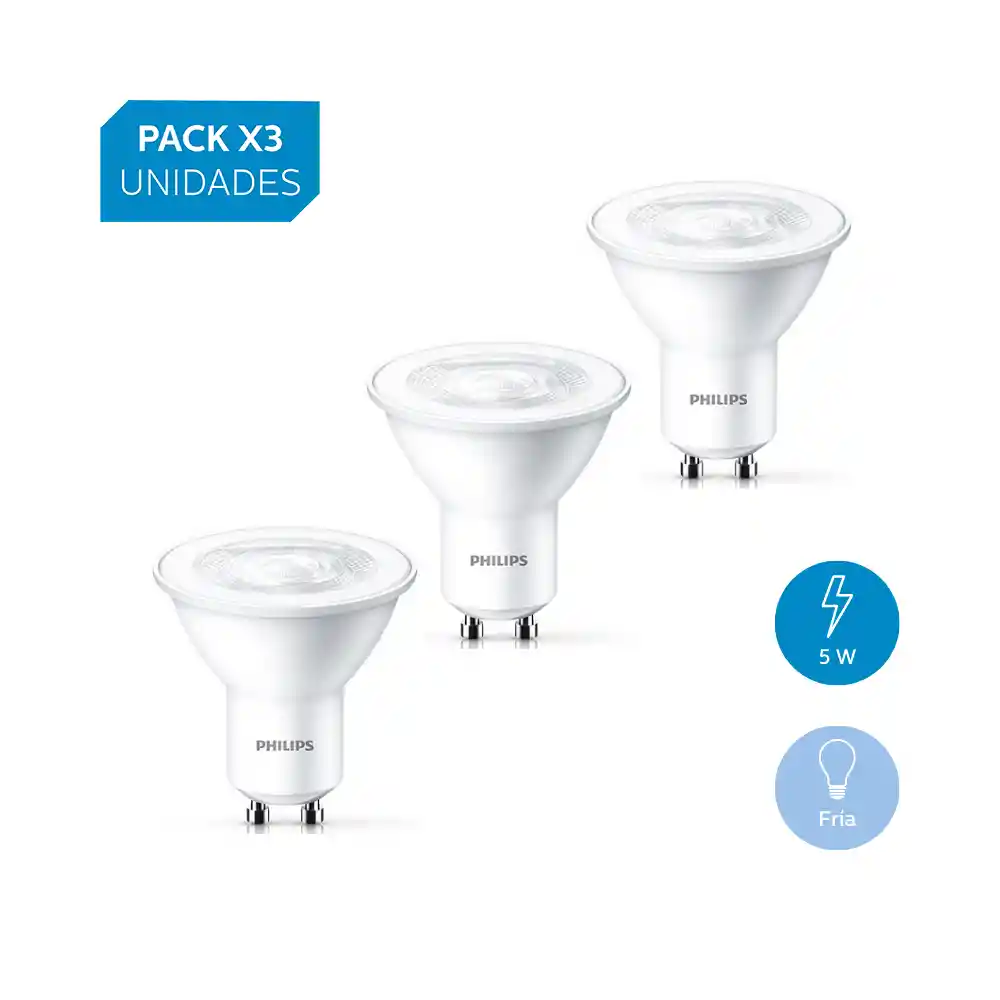 Packx3 Bombilla LED tipo dicroico 5W GU10 Luz Fria -SKU- 440500000141 Una nueva generación de reflectores GU10 LED son ideales para la iluminación general y de acentuación integrándose perfectamente a un diseño interior. Potencia en Watts5W Forma Spot BaseGu10 Voltaje100-240V Temperatura de Color (K)Luz Fría Vida Útil (hrs)15000 Flujo Luminoso350 Lm Dimerizable No Garantia 3 años