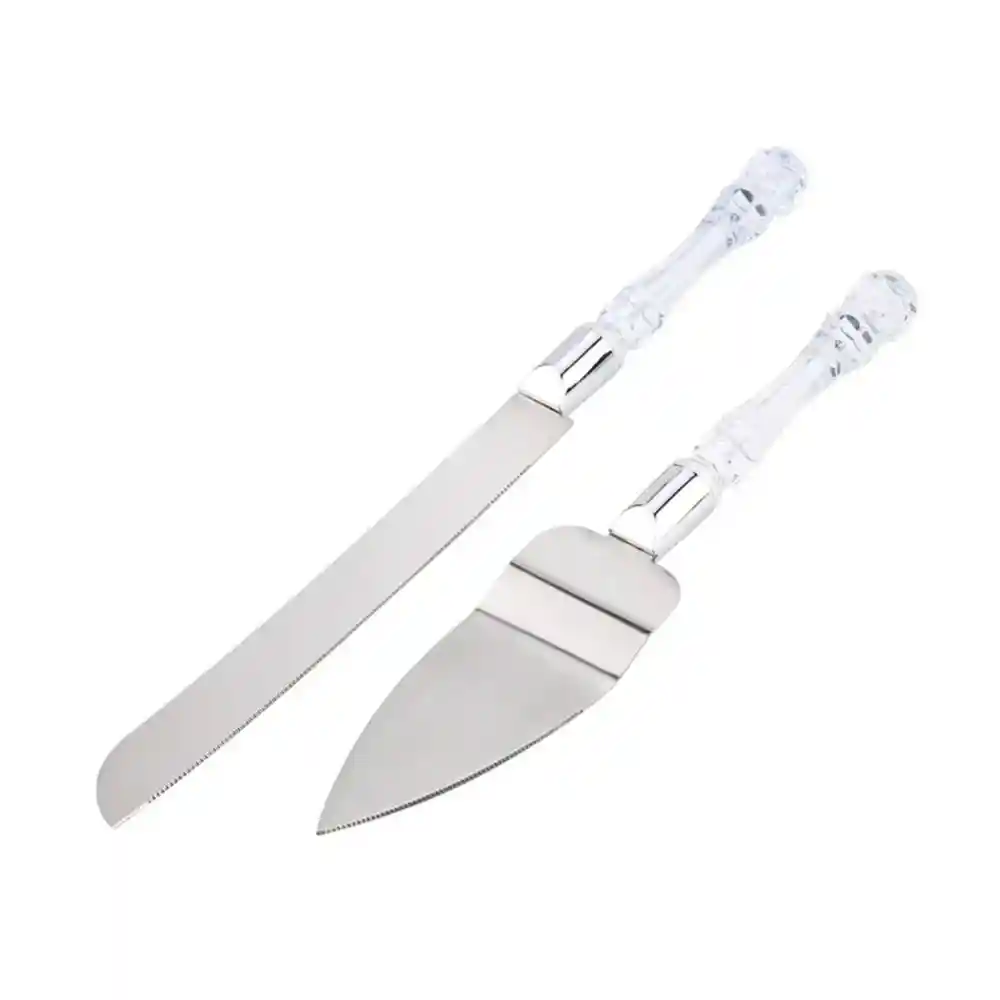 Set de cuchillo y pala para servir, herramientas perfectas para completar tu mesa, diseñas en acero con acabado en acrílico. Especial para cortar tortas y ponqués. Tamaño: El cuchillo mide 32,5 cm (20,5 cm hoja + 10 cm mango) La pala mide 27,5 cm (14,5 cm hoja + 13 cm mango.