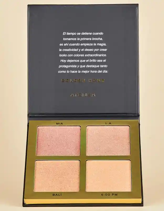 Esta paleta de iluminadores incluye 4 tonalidades entre oro rosa y doradas que son satinadas de alta pigmentación.