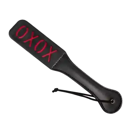 Paleta de nalgadas con agarre rígido y doble punta. Grabado en la parte superior “XOXO”. Características: Material látigo: Cuero sintético Largo total: 32 cm Ancho: 6 cm Color: Negro