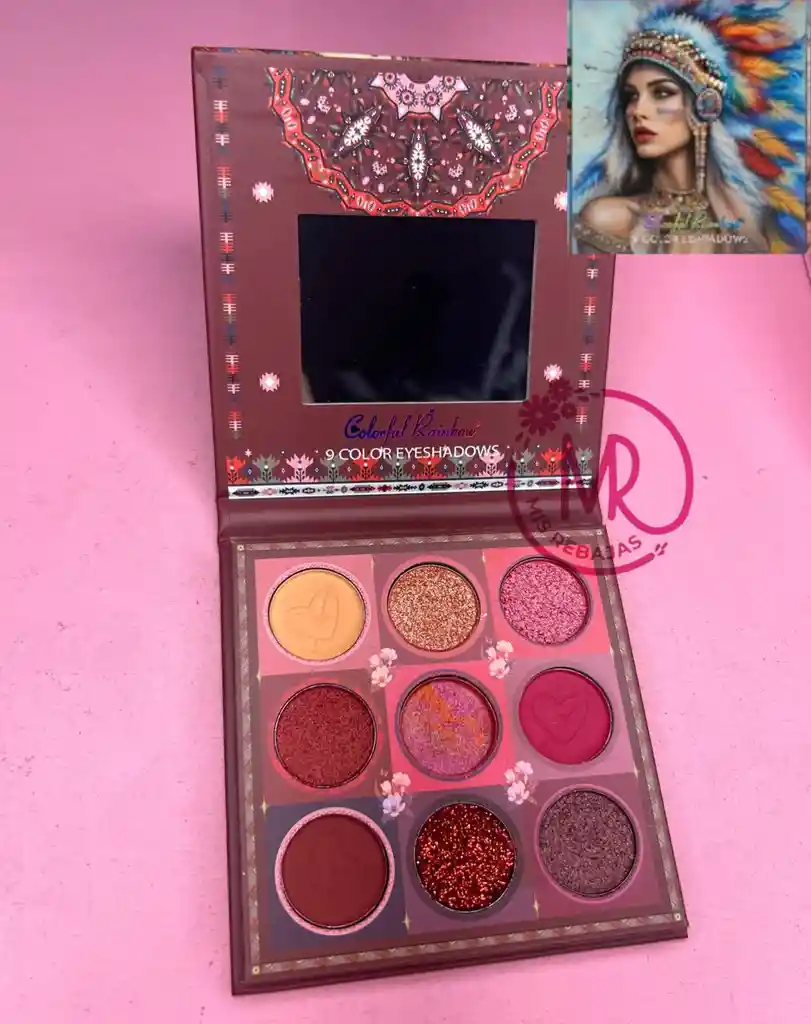 Paleta de sombra con 3 tonos mate, 5 tonos satinado y 1 con glitter.
