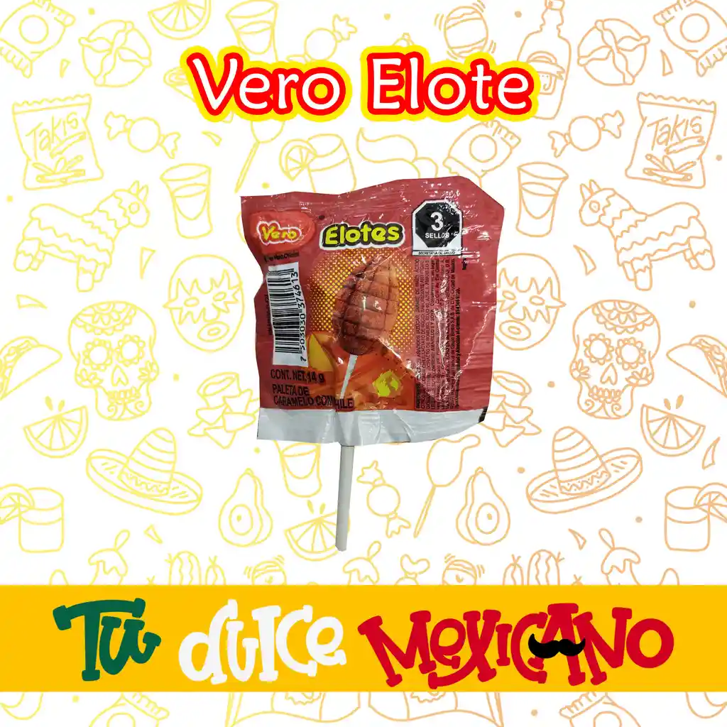 forma de mazorca de maíz, que combina caramelo macizo de sabor dulce (a menudo con un toque de fresa o vainilla) cubierto con chile en polvo