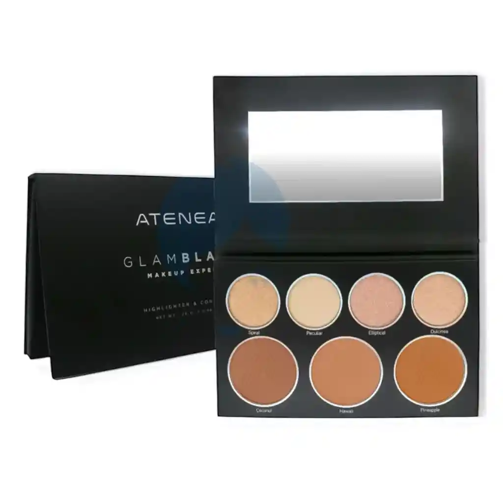La paleta Atenea cuenta con 4 tonos de iluminadores y 3 bronceadores con los que tendrás la oportunidad de crear tonos únicos para tus maquillajes dependiendo de la ocasión. Iluminadores: Con estos iluminadores podrás darle luz a tu piel, tener un maquillaje natural con un toque fresco y destacar las partes altas de tu rostro. Contornos: Con estos contornos podrás dar profundidad a tu facciones y disimular las partes de tu cara más prominentes como lo son la frente, bajo los pómulos, en la nariz y levemente en el mentón.